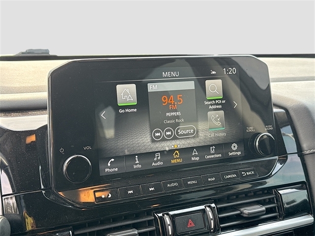 18`` Machined Alloy Wheels, 20`` Alloy Wheels, 2nd-Row Captain Chairs, 2nd-Row Removable Center Console, 3rd row seats: bench, 4-Wheel Disc Brakes, 6 Speakers, ABS brakes, Air Conditioning, Alloy wheels, AM/FM radio: SiriusXM, Auto High-beam Headlights, Auto-dimming Rear-View mirror, Automatic temperature control, Axle Ratio: TBD, Black Splash Guards (Set of 4), Bose Premium Audio System, Brake assist, Bumpers: body-color, Captain`s Chairs Carpeted Floor Mats (Set of 4), Cross Bars, Delay-off headlights, Driver door bin, Driver vanity mirror, Dual front impact airbags, Dual front side impact airbags, Electronic Stability Control, Emergency communication system: NissanConnect Services, Exterior Parking Camera Rear, Four wheel independent suspension, Front anti-roll bar, Front Bucket Seats, Front Center Armrest, Front dual zone A/C, Front fog lights, Front reading lights, Fully automatic headlights, Garage door transmitter: HomeLink, Heated door mirrors, Heated Front Bucket Seats, Heated front seats, Heated Rear Seats, Heated steering wheel, Illuminated entry, Knee airbag, Leather Seating Surfaces, Leather steering wheel, Low tire pressure warning, Navigation system: NissanConnect Navigation, NissanConnect w/Navigation & Services, Occupant sensing airbag, Outside temperature display, Overhead airbag, Overhead console, Panic alarm, Panoramic Moonroof, Passenger door bin, Passenger vanity mirror, Power door mirrors, Power driver seat, Power Liftgate, Power passenger seat, Power steering, Power windows, Radio data system, Radio: AM/FM Audio System, Rear air conditioning, Rear anti-roll bar, Rear reading lights, Rear seat center armrest, Rear side impact airbag, Rear window defroster, Rear window wiper, Reclining 3rd row seat, Remote keyless entry, Security system, SL Premium Package, Speed control, Speed-sensing steering, Split folding rear seat, Spoiler, Steering wheel mounted audio controls, Tachometer, Telescoping steering wheel, Tilt steering wheel, Tow Hitch Receiver & Harness, Traction control, Trip computer, Turn signal indicator mirrors, Variably intermittent wipers, Wireless Charging Pad. Recent Arrival!